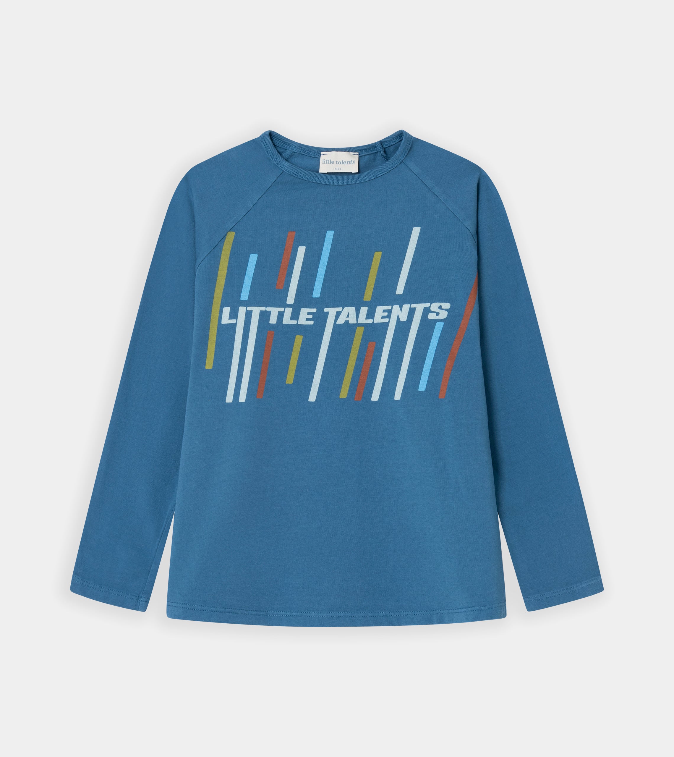 Blue t-shirt with "Little Talents" print on the front. Round neckline, rib trims, and raglan sleeves.